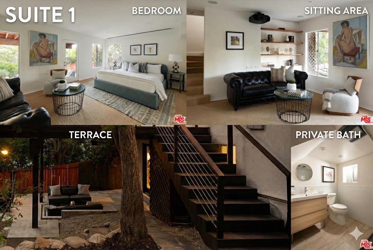 The two available bedrooms are both on their own floors of the house with their own bathrooms. One is a large bedroom big enough to include a sitting area, and the other is actually two bedrooms.