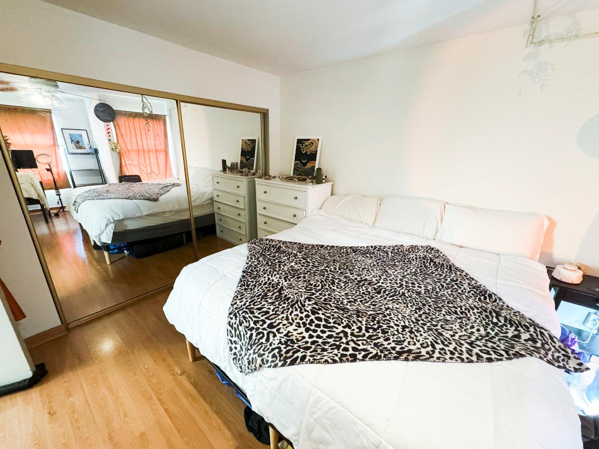The room has a big mirror closet, and central AC. Your room would be on the top floor, and you would share the floor with 2 others, & the bathroom with only one other housemate.